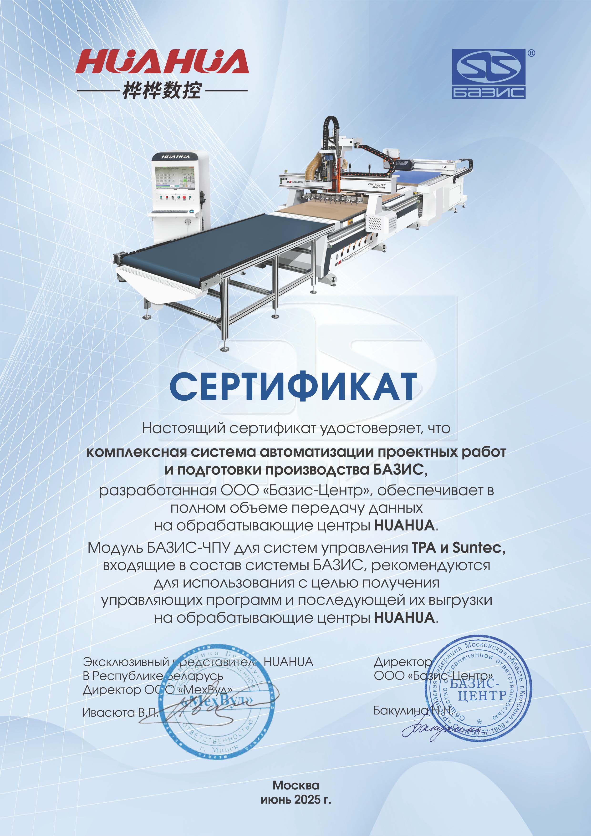 В июне 2025 года ООО МехВуд, являясь официальным эксклюзивным дилером на территории Республики Беларусь одного из ведущих заводов производителя оборудования для производства корпусной мебели под торговой маркой HUAHUA, прошел сертификацию, которая удостоверяет, что комплексная система автоматизации проектных работ и подготовки производства БАЗИС, разработанная ООО «Базис-Центр», обеспечивает в полном объеме передачу данных на ЧПУ оборудовании HUAHUA.Подтверждающая информация размещена на официальном сайте разработчика https://www.bazissoft.ru