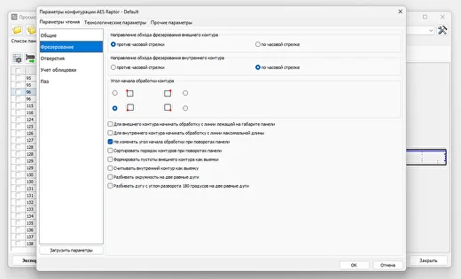 При формировании управляющей программы для ЧПУ, для получения корректных карт раскроя, предусмотрена настройка ряда параметров, учитывающих технологические особенности и ограничения пильного центра.