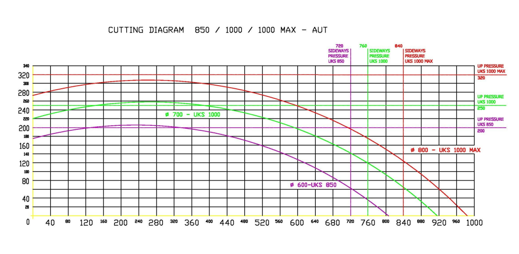 Автоматическая поперечная пила UKS 1000 предназначена для распиловки бревен, строительной древесины или досок с резкими краями, для которых требуется большой шаблон распила. Другое применение — распиловка досок и реек при производстве поддонов. В среднем эта пила может обработать 33–35 м3 пиломатериалов для поддонов за смену (8 часов), или примерно 25 000 штук блоков для поддонов. При распиловке брёвен длиной 5 метров и средним объёмом 0,25 м3 на бревно производительность составляет примерно 6 м3 брёвен в час. Пилой может управлять один работник при использовании поперечного конвейера, по которому подаётся распиливаемый материал, например, от рамной пилы. Наличие второго работника ограничено весом и количеством материала, загружаемого на станок без поперечного конвейера.
