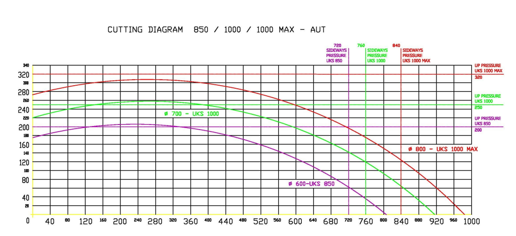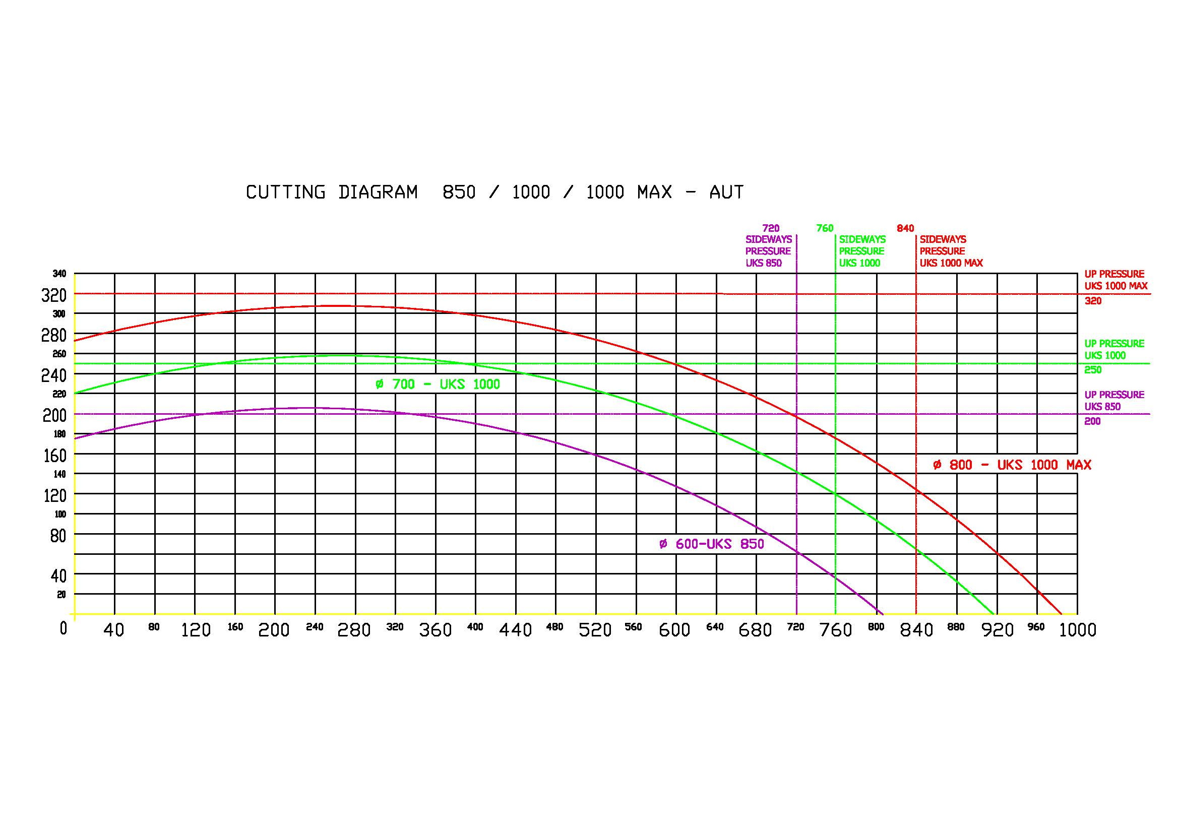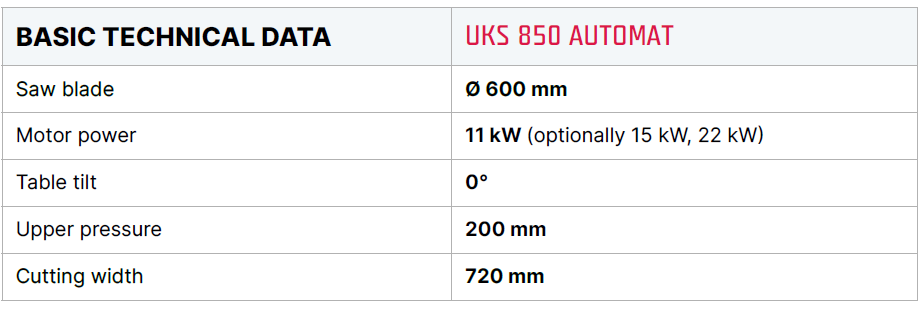 Автоматическая поперечная пила UKS 850 предназначена для распиловки бревен, строительной древесины или досок с резкими краями, для которых требуется большой шаблон распила. Другое применение — распиловка досок и реек при производстве поддонов. В среднем эта пила может обработать 30–33 м3 пиломатериалов для поддонов за смену (8 часов), или примерно 23 000 штук блоков для поддонов. При распиловке брёвен длиной 5 метров и средним объёмом 0,25 м3 на бревно производительность составляет примерно 5 м3 брёвен в час. Пилой может управлять один работник при использовании поперечного конвейера, по которому подаётся распиливаемый материал, например, от рамной пилы. Наличие второго работника ограничено весом и количеством материала, загружаемого на станок без поперечного конвейера.