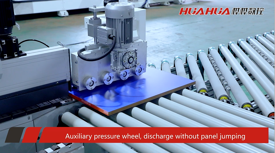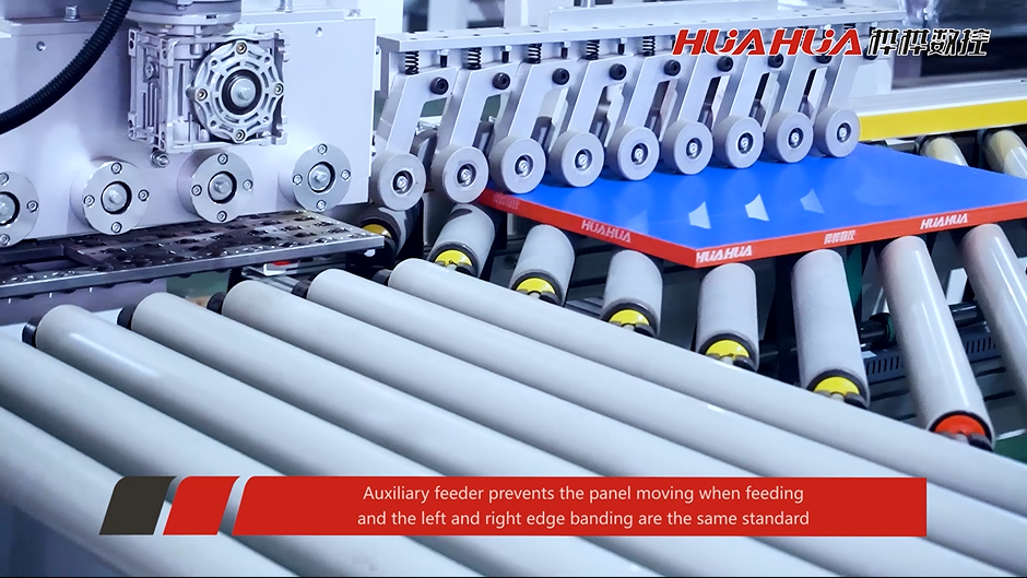 Вспомогательный подающий механизм предотвращает смещение панели при подаче, а левая и правая кромки обжимаются по одному стандарту. Затем панель подается на второй кромкооблицовочный станок