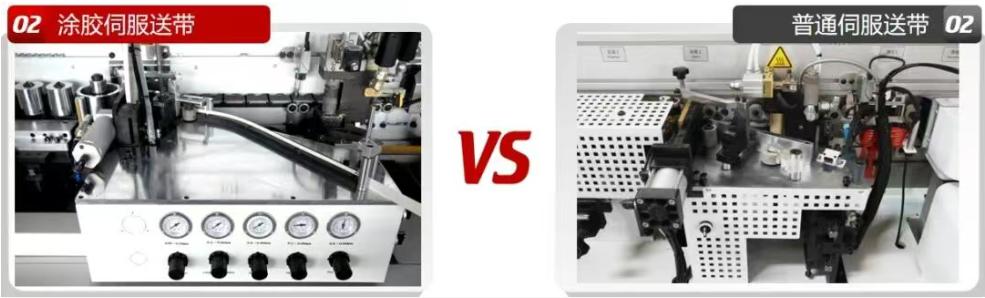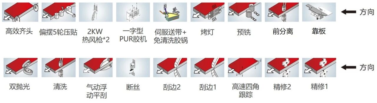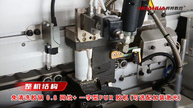 Безочисточный клеевой бак с валиком 0,8 мм и прямолинейная PUR‑клеемашина; двухчастотный режим позволяет смешивать клей под разные цвета кромки.