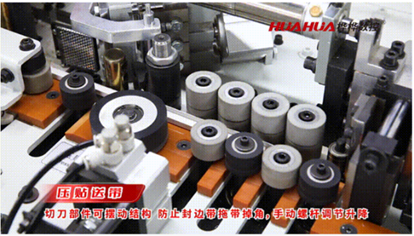 • Поворотная конструкция ножевого блока позволяет избежать вытягивания кромочной ленты и сколов кромки на углах.