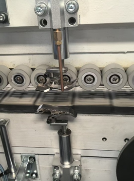 Роликовая группа прижима кромки из 5 роликов для прессования клея с полимерным покрытием (PUR/EVA). Усиливает эффект склеивания и обеспечивает ровное уплотнение кромок