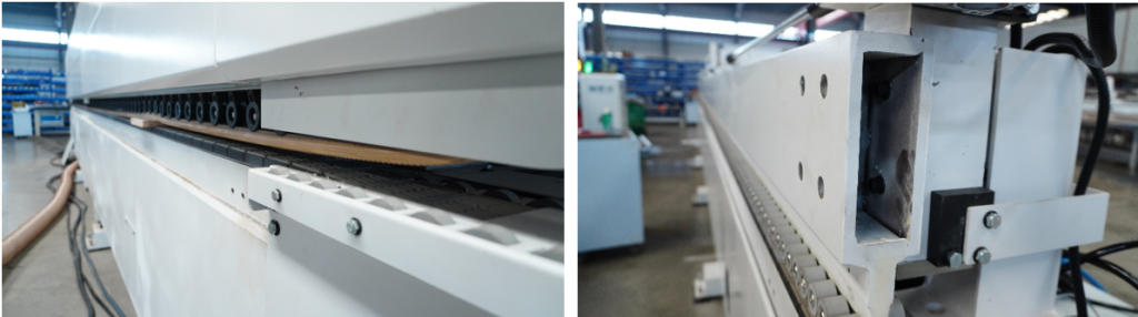 Пятиколонная конструкция, как важный несущий элемент кромкооблицовочного станка, поддерживает вес корпуса, траверсы и различных рабочих модулей, минимизирует вибрации и гарантирует точность и качество обработки кромки.