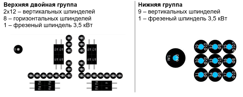 2 сверлильные головы сверху + 1 сверлильная голова снизу